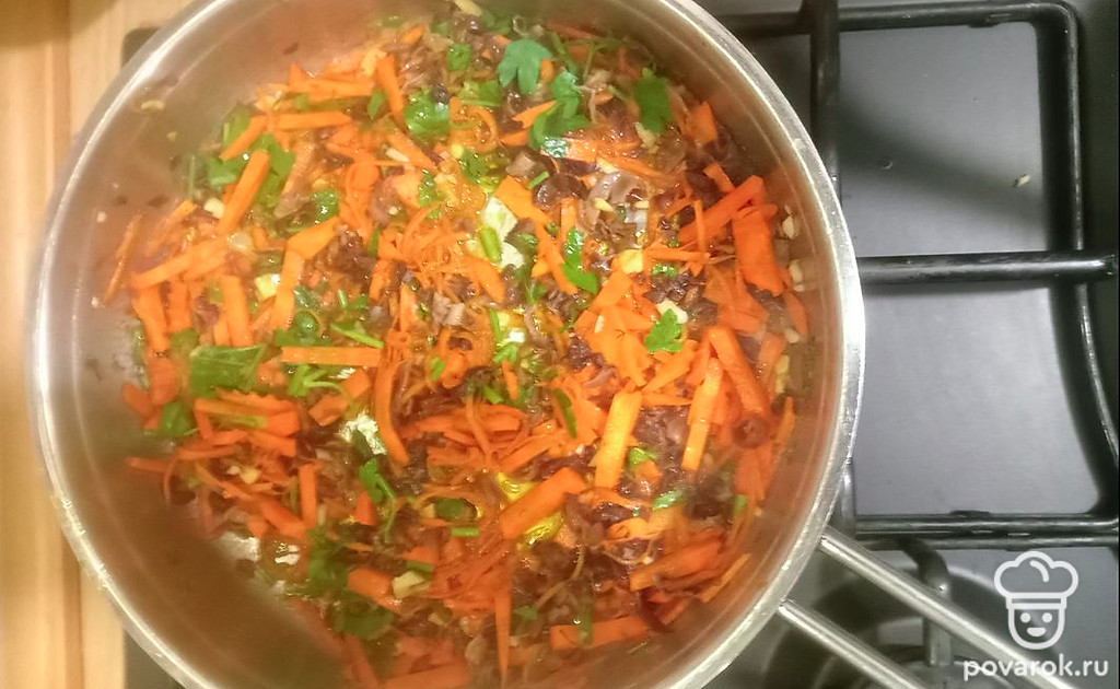Поставьте сковороду на средний огонь, налейте растительное масло. Добавьте на сковороду морковь, грибы, чеснок и петрушку с укропом. Медленно помешивайте овощи, пока морковь и грибы не станут золотистыми и сочными.
