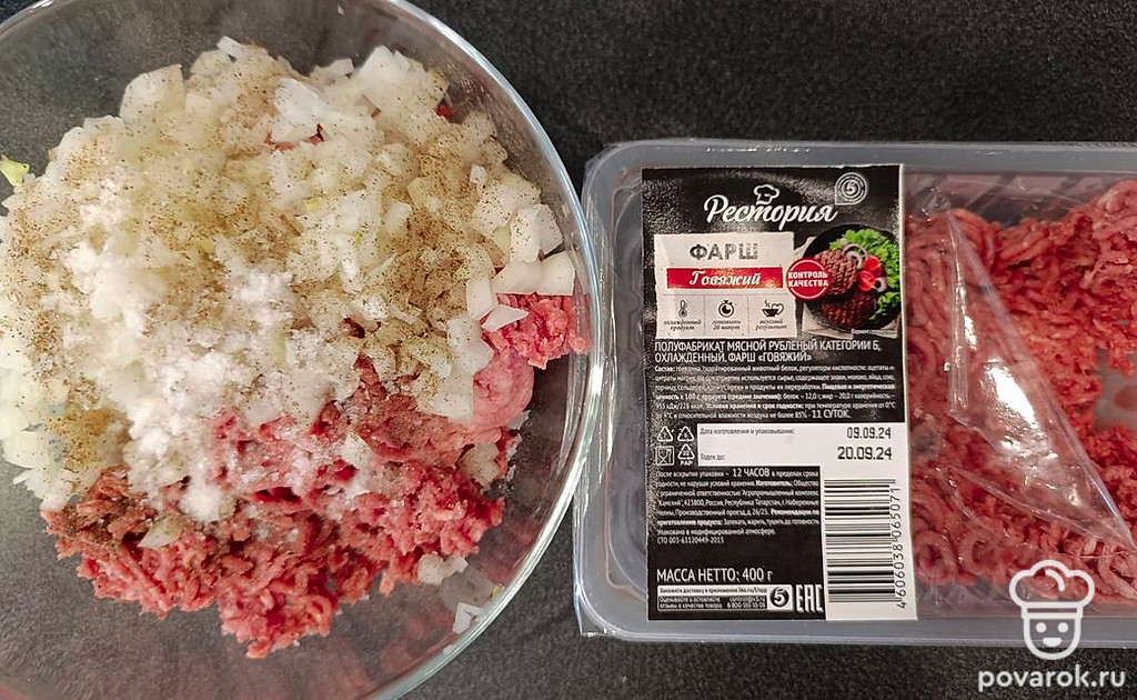 Приготовьте начинку для пельменей. Мелко нарежьте лук. Добавьте в фарш лук, черный молотый перец и соль по вкусу, перемешайте.