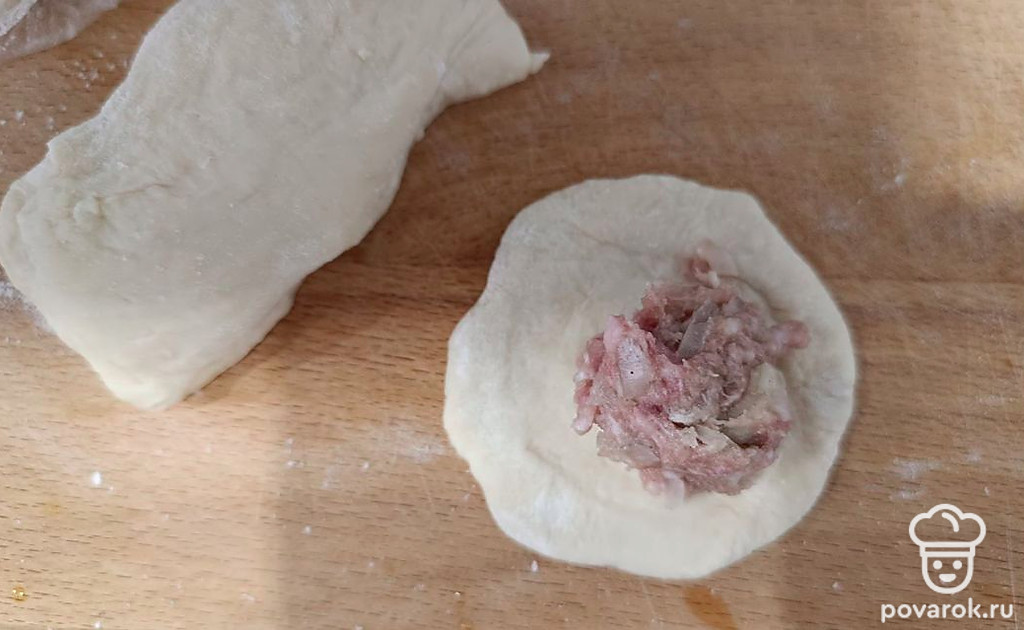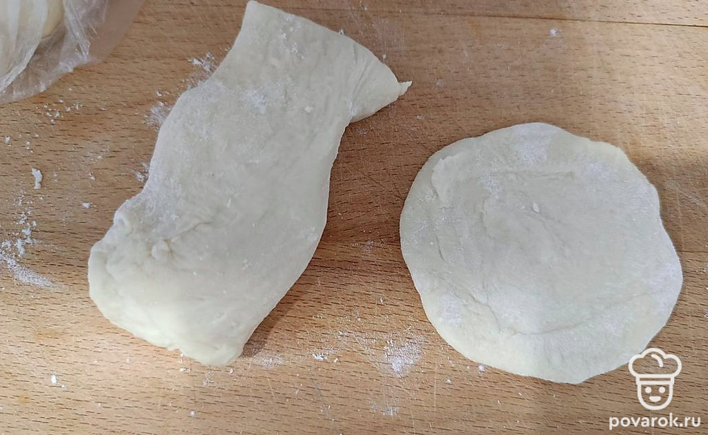 Из теста сформируйте небольшие лепешки для пельменей. Раскатайте.