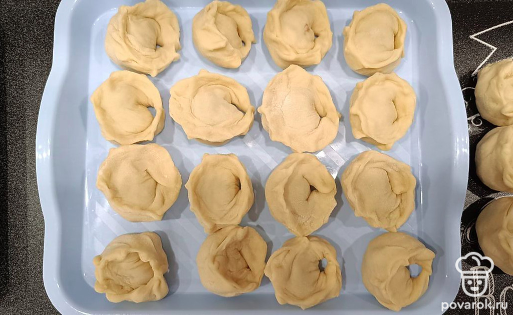 Закрепите тесто вокруг начинки (по краям). Сформируйте пельмени.
