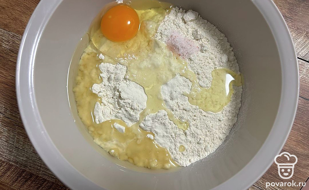 В миске смешайте муку, яйцо, 1 чайную ложку соли и масло.