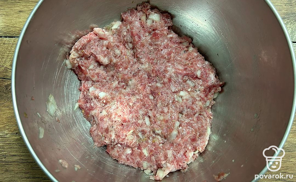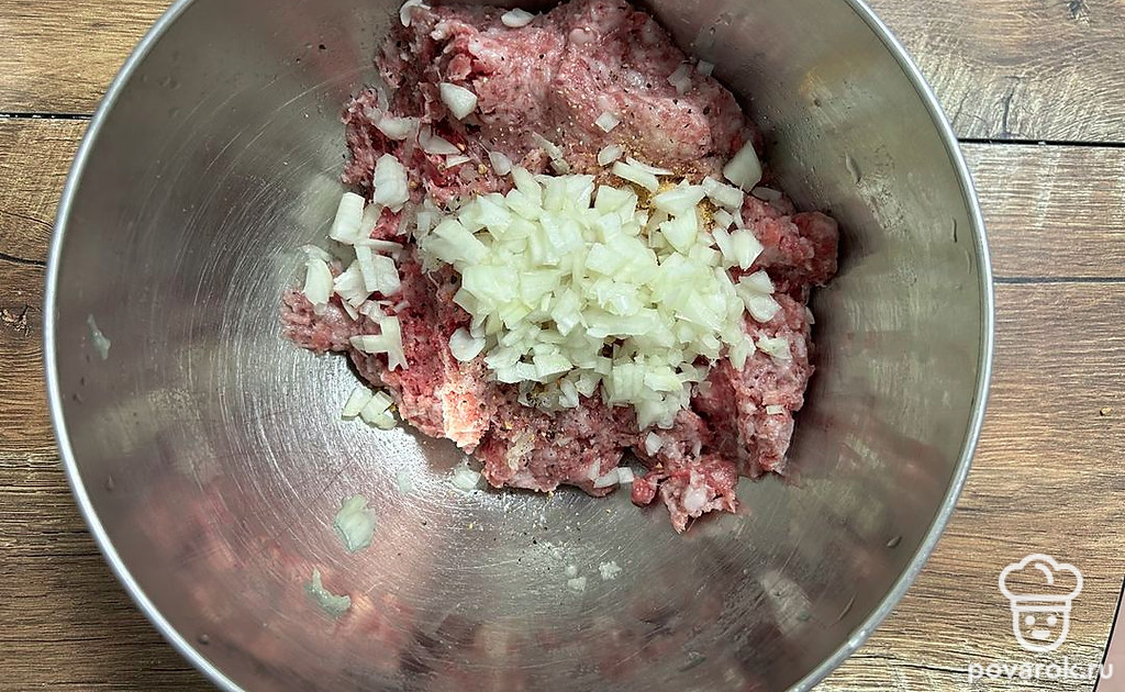 К фаршу добавьте нарезанный кубиком лук и сушеный чеснок. Посолите и поперчите по вкусу.