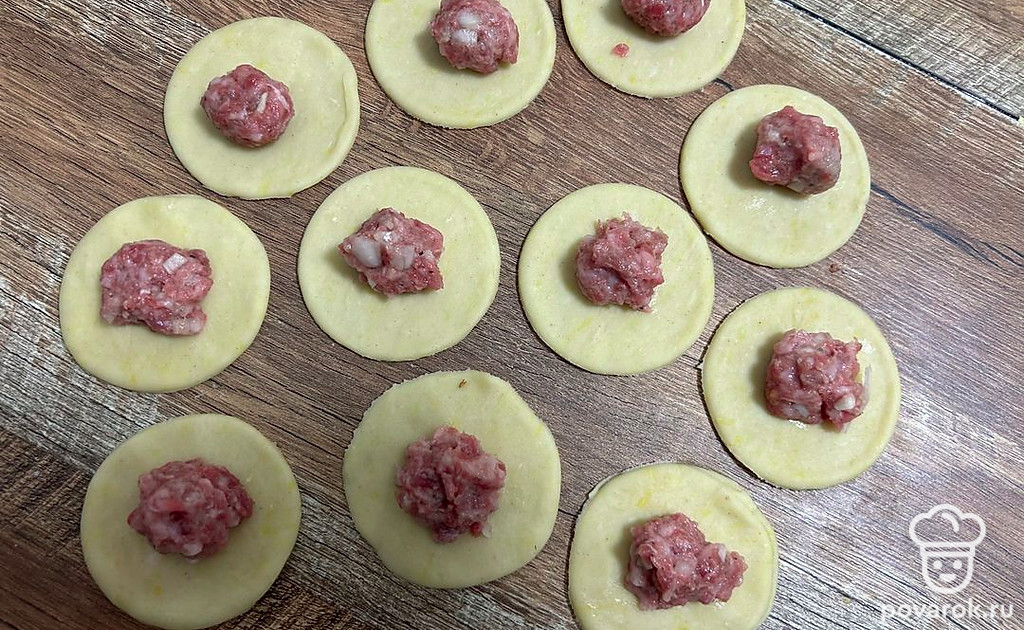 На кружки теста выложите фарш (примерно 1 чайную ложку без горки).
