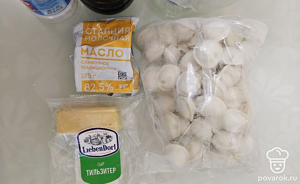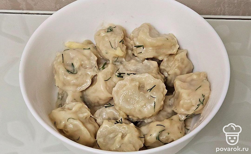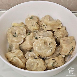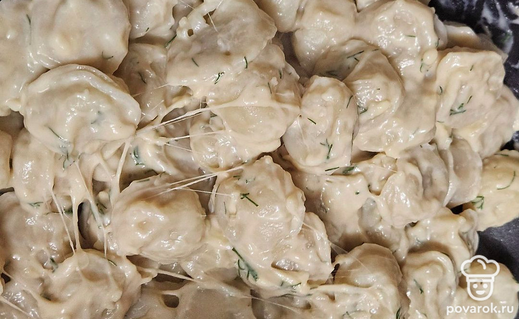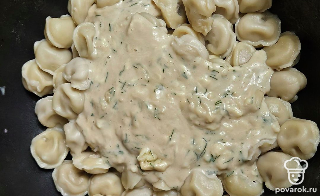Залейте пельмени соусом. Аккуратно перемешайте.