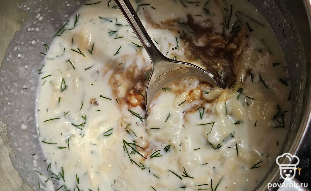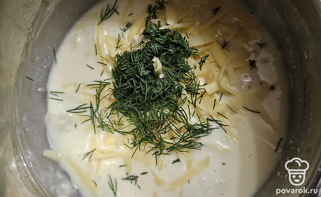 Укроп помойте и мелко нарежьте. Добавьте сыр и укроп в соус, хорошо перемешайте.