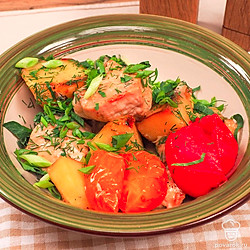 Казан-кебаб из курицы подавайте в горячем виде с большим количеством зелени, запеченными овощами.