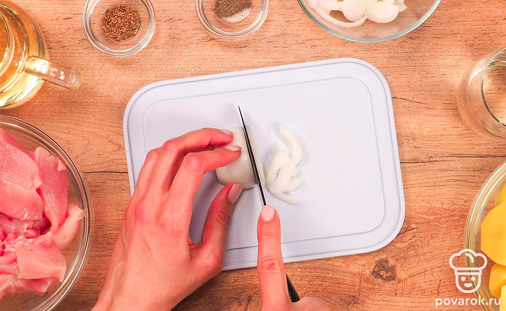 Промойте мясо и промокните бумажным полотенцем. Картофель и лук очистите от кожуры, промойте. Зелень укропа промойте водой, просушите на бумажных полотенцах и мелко нарежьте. Порежьте продукты. Лук нарежьте полукольцами. Картофель разрежьте пополам. Филе порежьте крупными кусками.