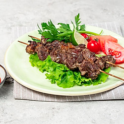 Промойте и обсушите говядину. Нарежьте ее небольшими кусками. Очистите лук и натрите его на терке. Помойте и разрежьте лимон для выдавливания сока. Помойте и просушите зелень. Мелко ее нашинкуйте. На 1 час замочите в воде деревянные шпажки, это поможет им выдержать жар духовки. Разогрейте духовку до 250 градусов.