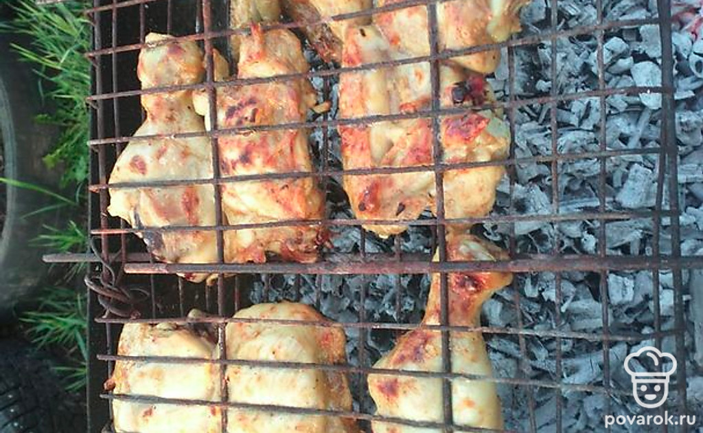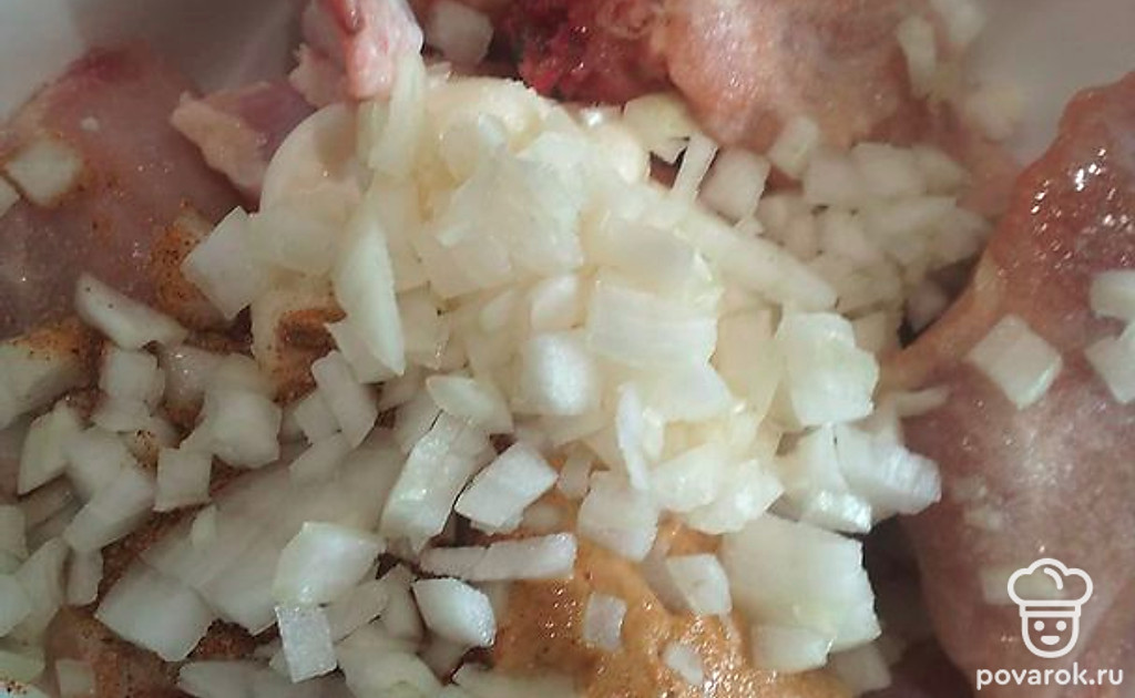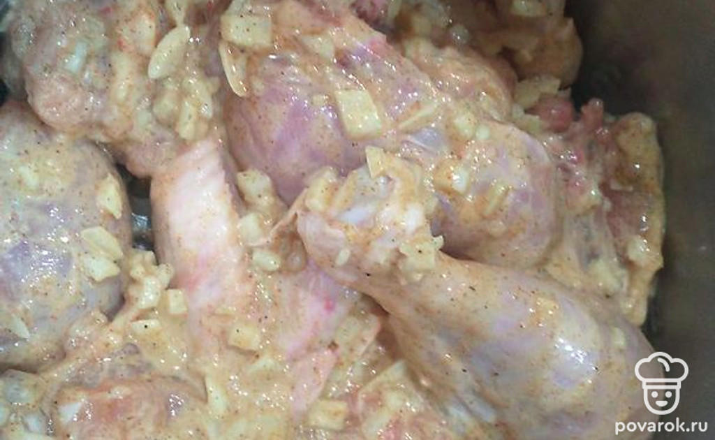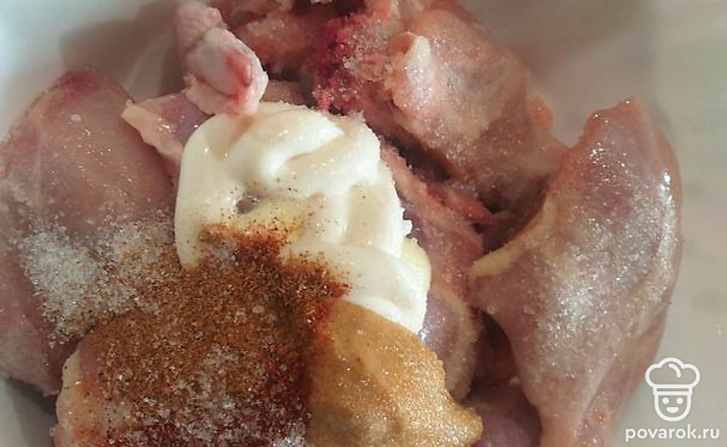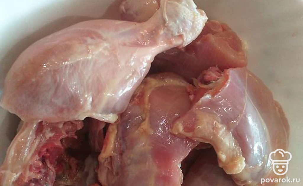 Курицу нарезать на порционные кусочки, удалить кожу.
