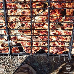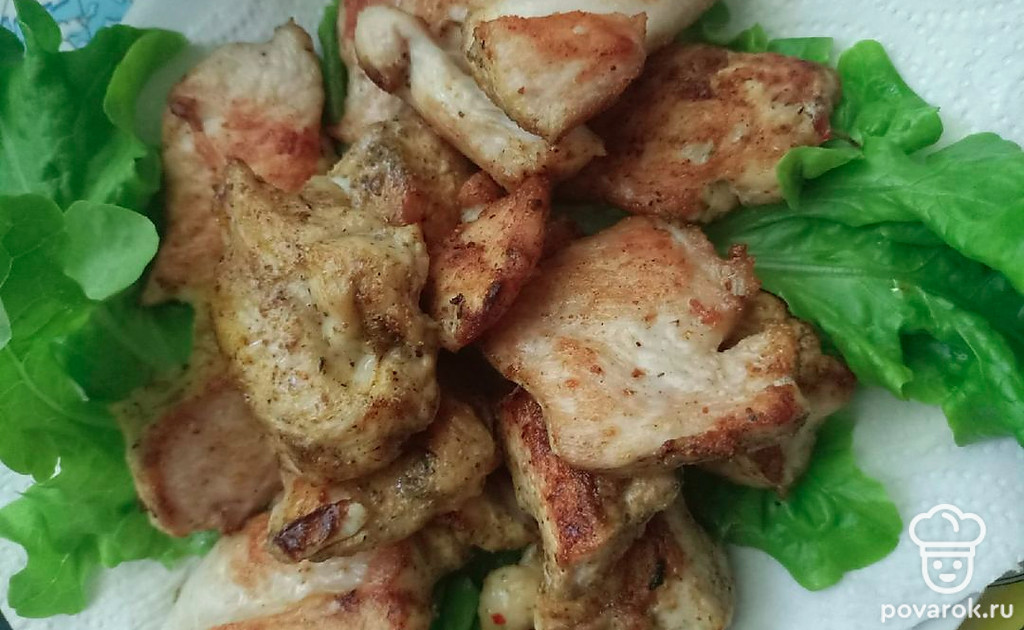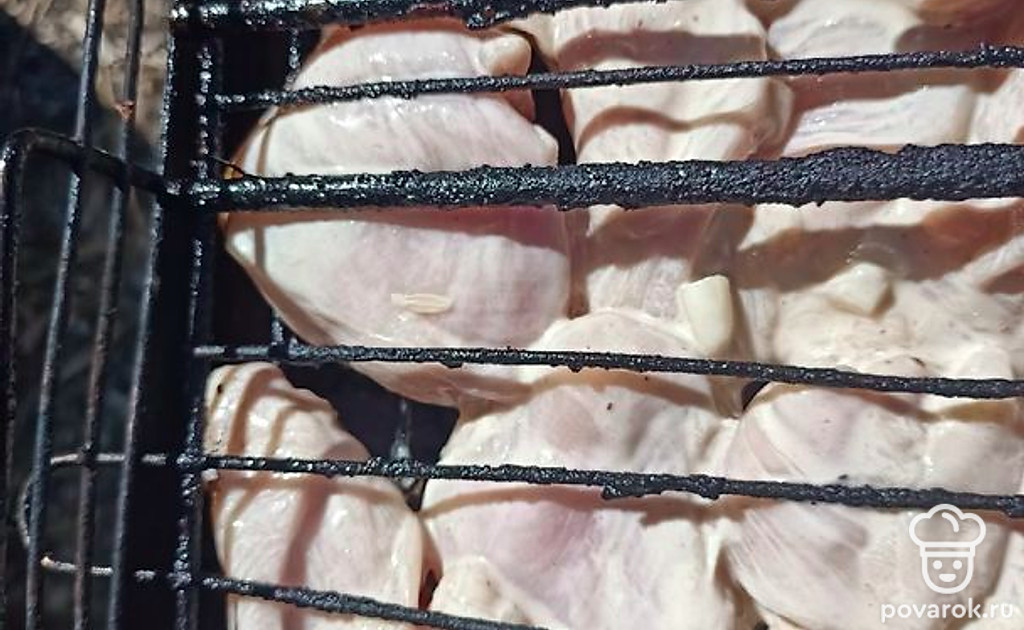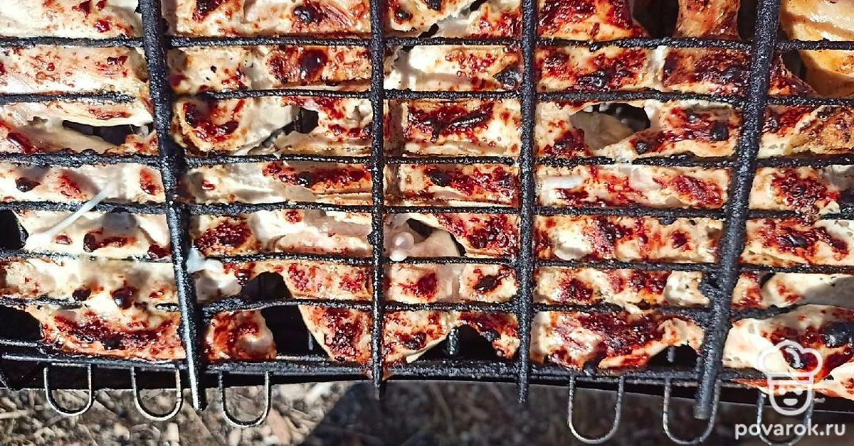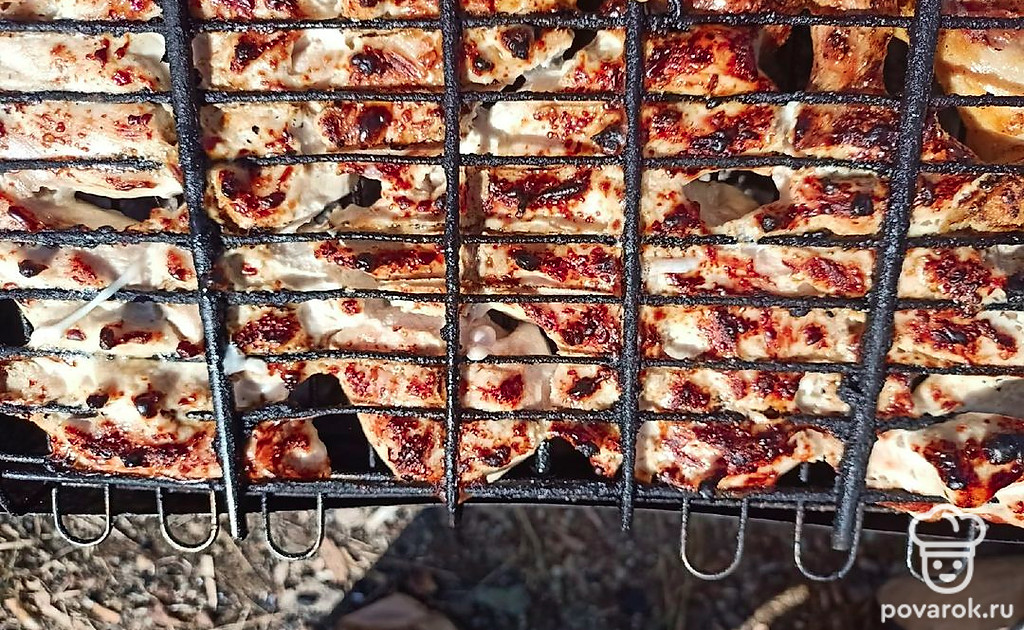 Замаринованную грудку выложить на решётку и поставить на угли. Обжаривать с двух сторон до готовности.