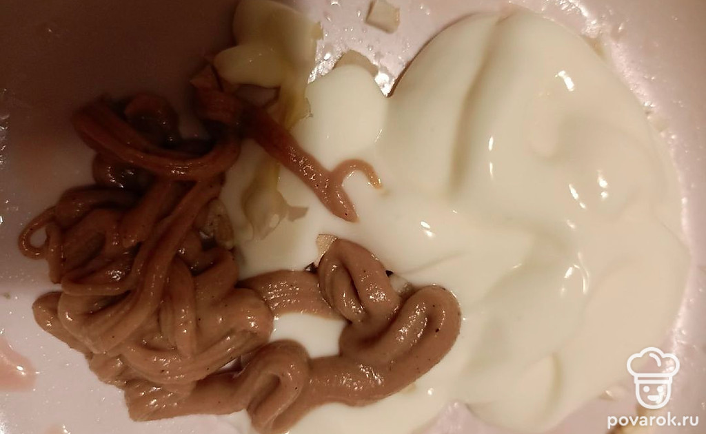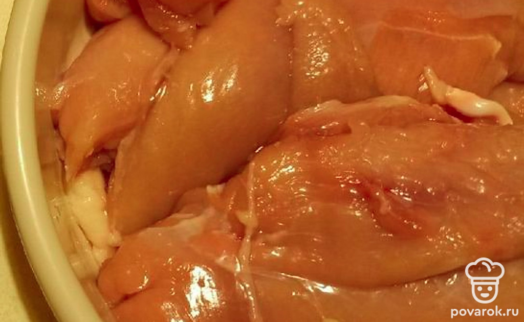 Нарезанную грудку смешать со смесью майонеза, горчицы, чеснока. Оставить в холодильнике на 1 час.