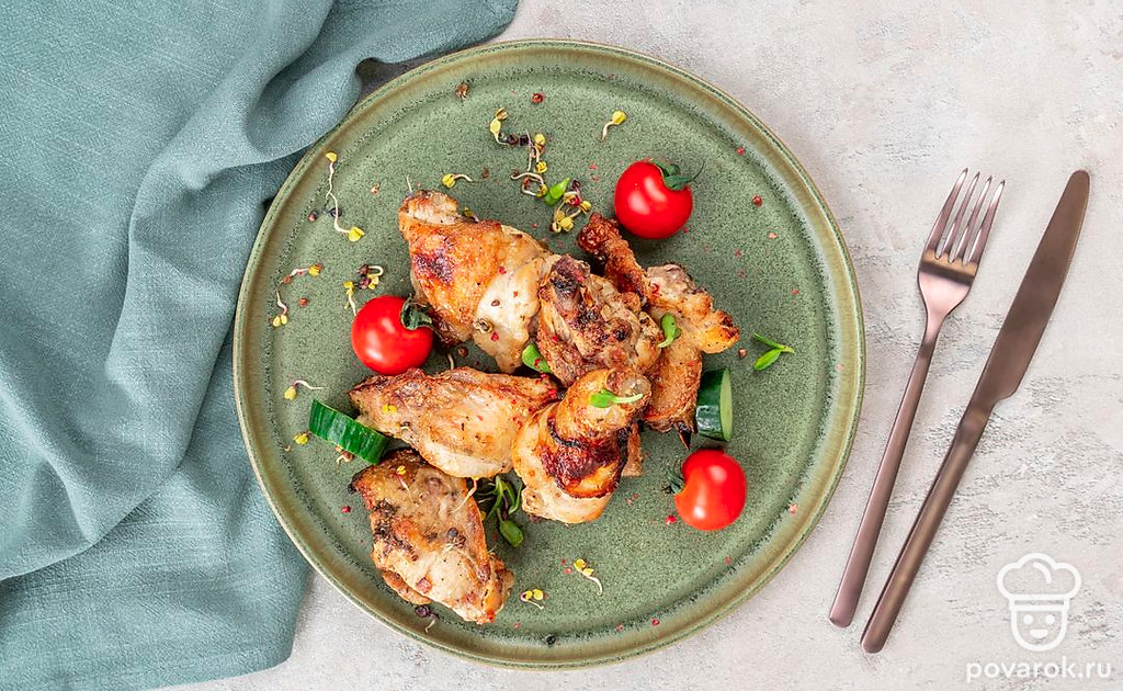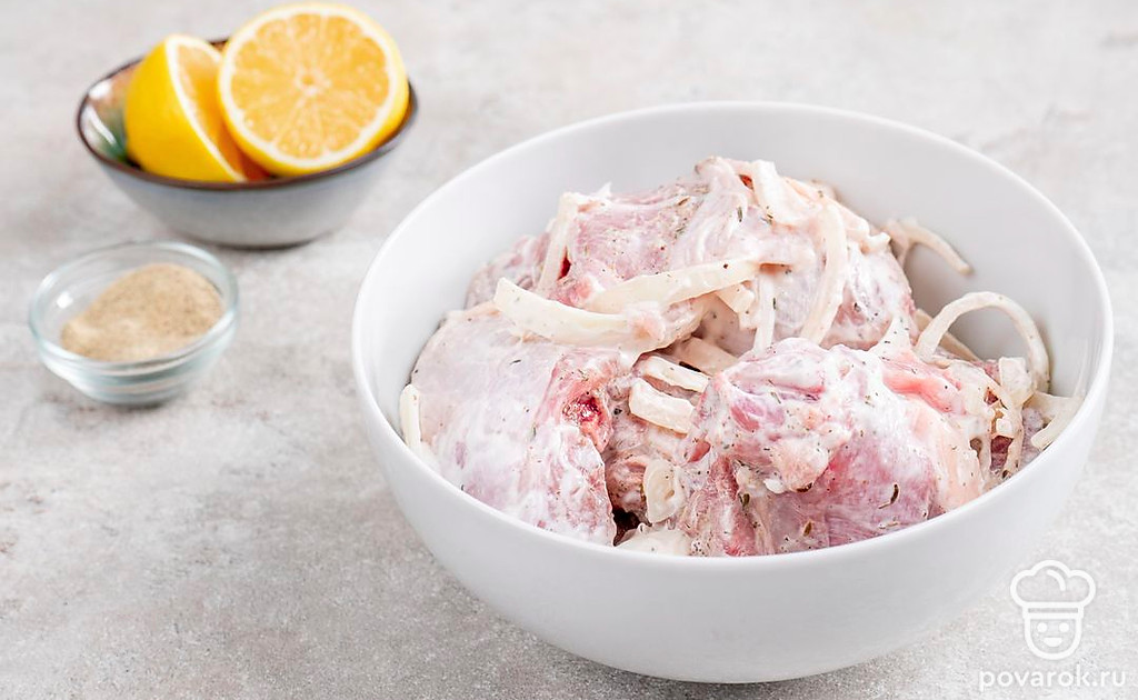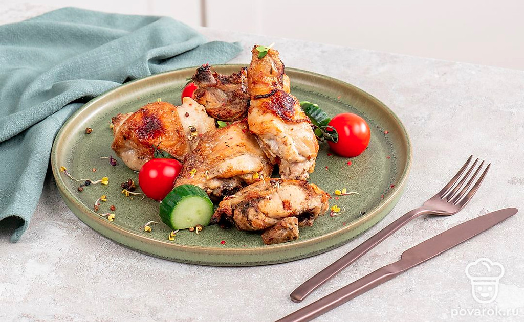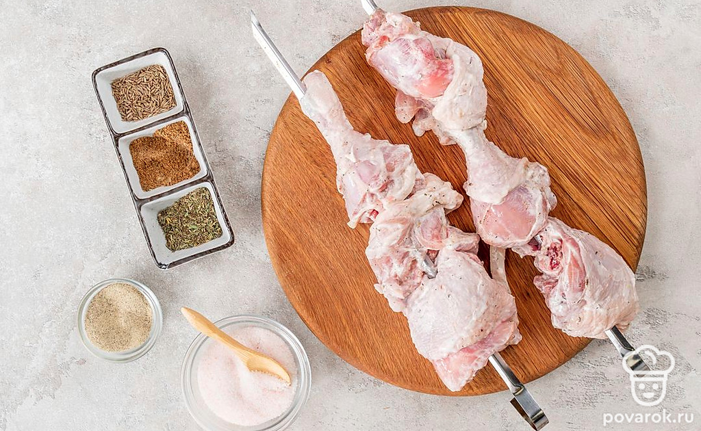Чтобы сделать куриный шашлык более сочным, мы взяли куриные ножки. Ничего страшного, если запекать мясо прямо с косточками. Достаточно лишь разрезать бедрышки и голени, чтобы птица быстрее и равномернее приготовилась.