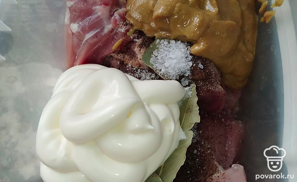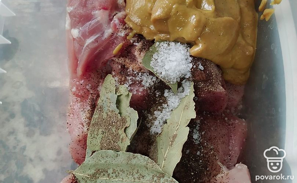 Лук почистить, нарезать колечками, переложить в контейнер. Мясо тоже положить в контейнер. Посыпать солью, поперчить, добавить лавровый лист и горчицу.