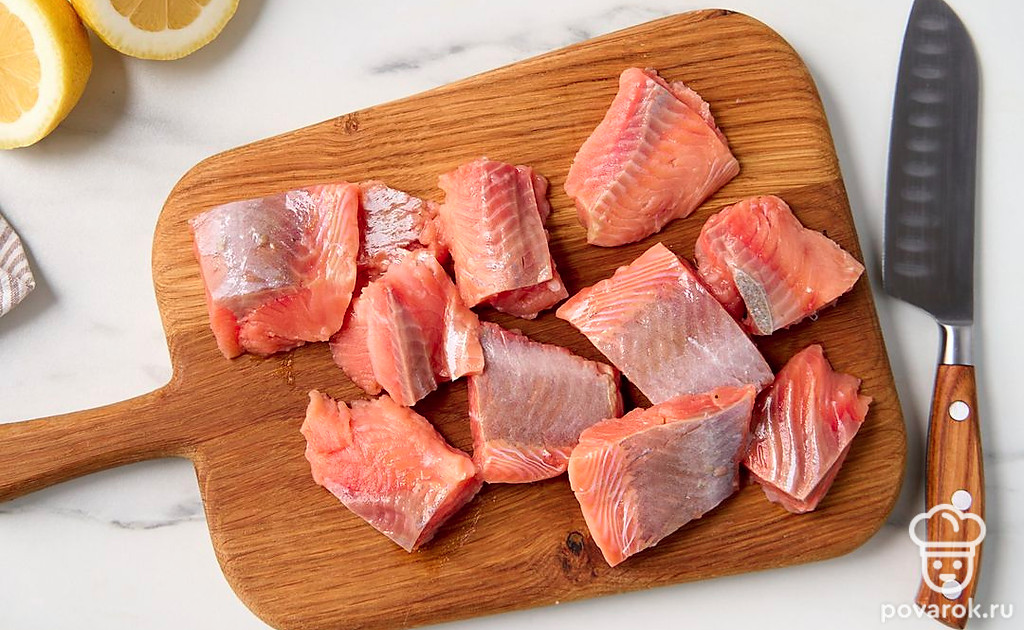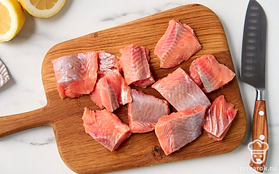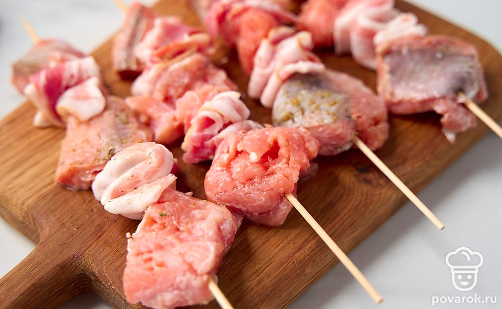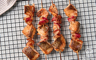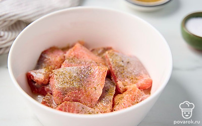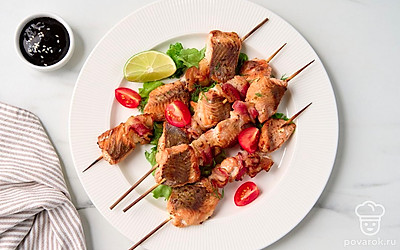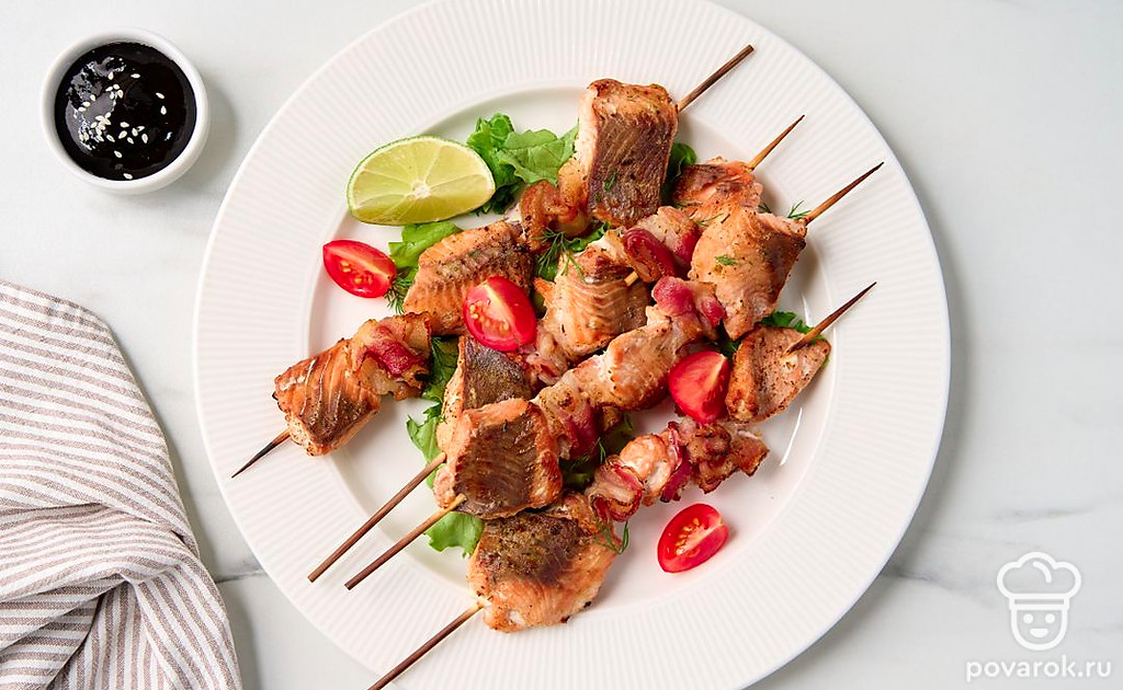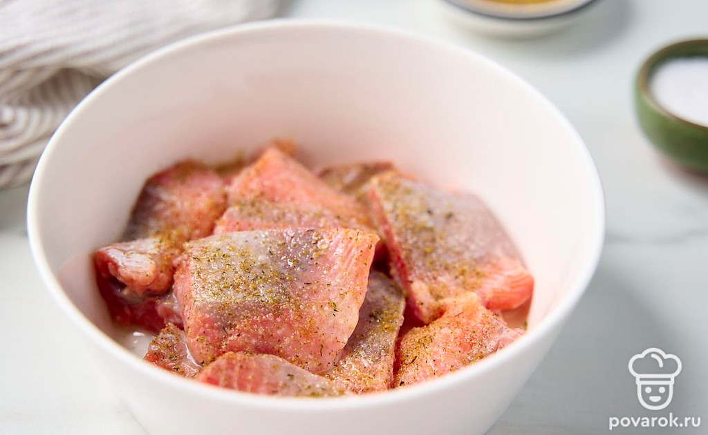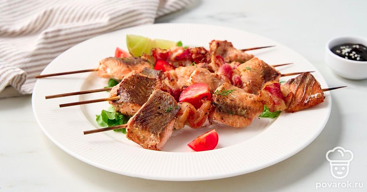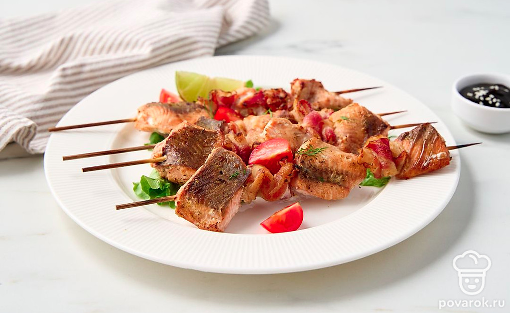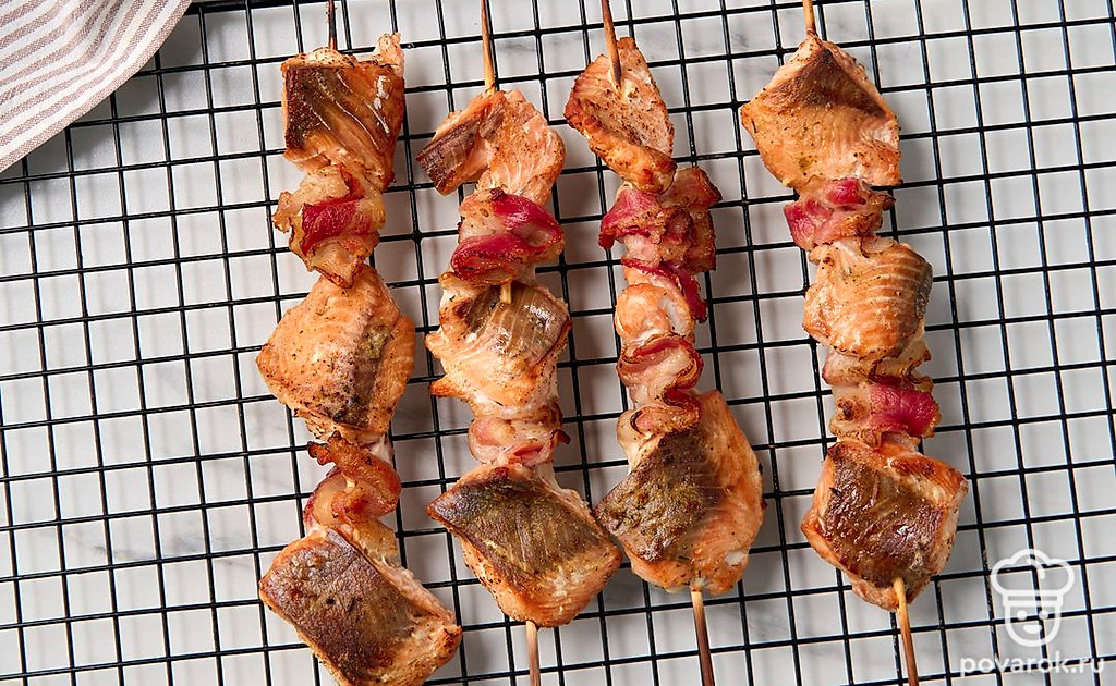 Для шашлыка из горбуши можно выбрать специи на свой вкус или взять готовый набор приправ. Маринуется горбуша очень быстро, 10-15 минут в специях будет достаточно. Шампуры лучше заменить на деревянные шпажки, они тоньше и не разломают кусочки рыбы. При надевании горбуши на шпажки оставляйте между кусочками небольшое пространство, чтобы все ломтики приготовились одновременно и равномерно. Подать рыбные шашлычки можно в качестве легкой закуски или с гарниром для полноценного обеда.