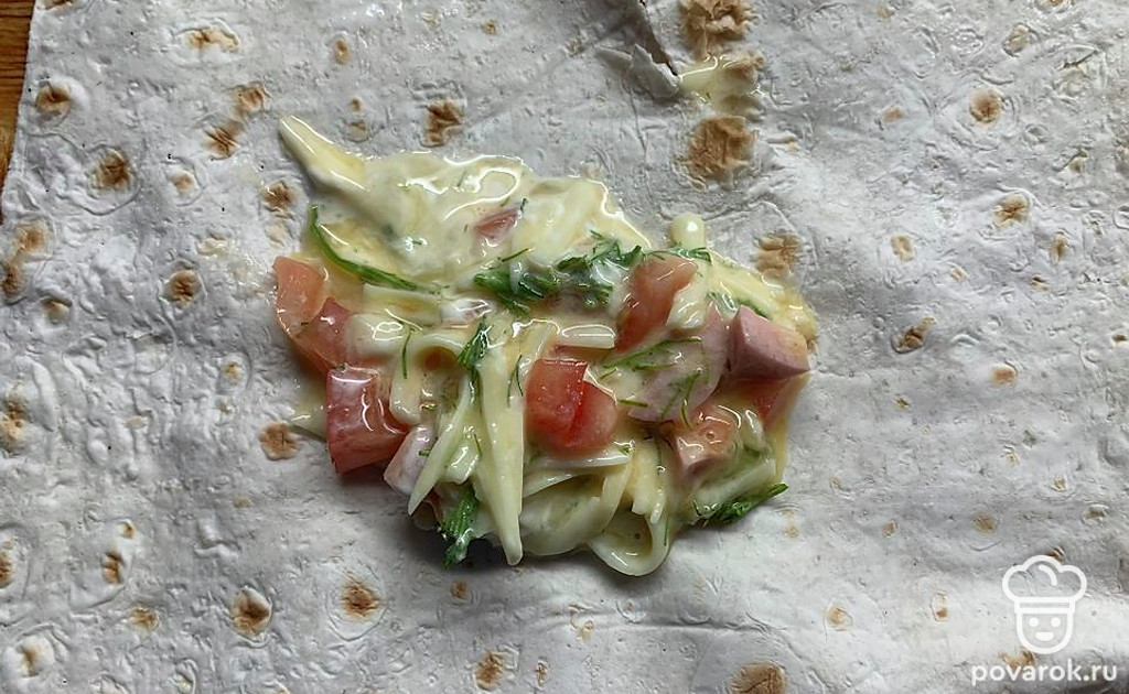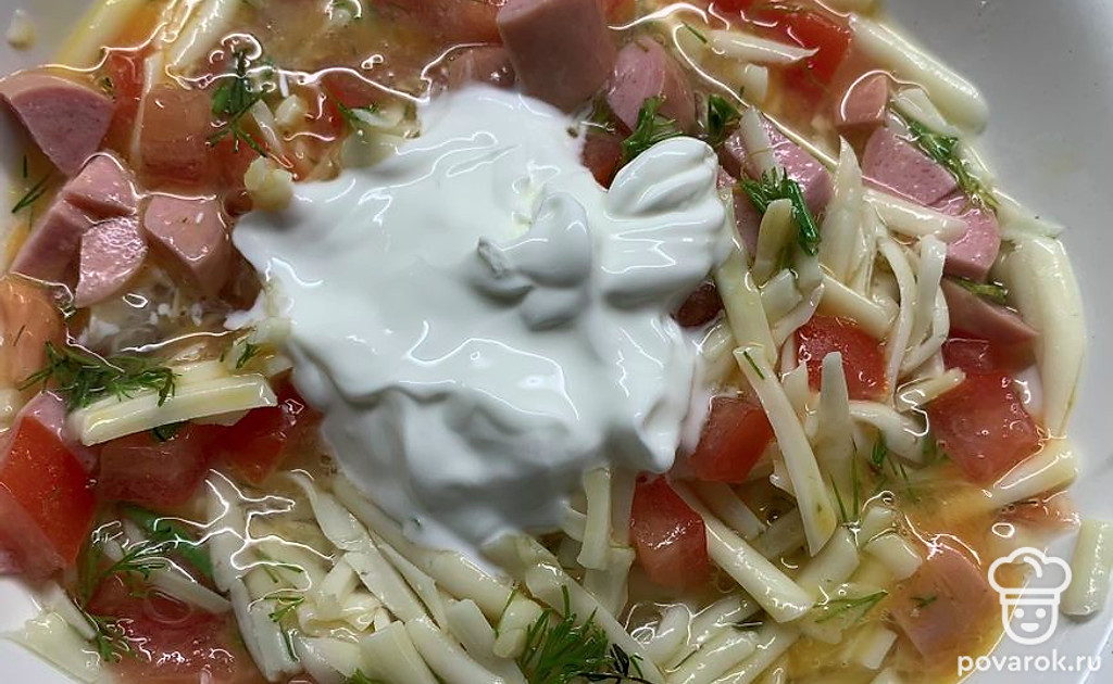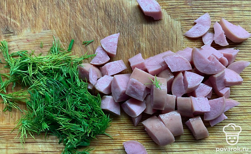 Соедините яйца, зелень, сыр, помидоры и сосиски.