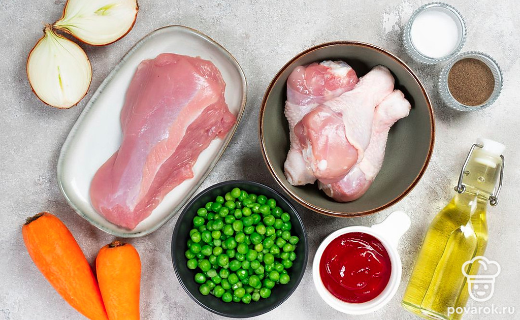 Филе индейки, голени курицы и петрушку промойте и обсушите. Петрушку мелко нарежьте. Мясо курицы срежьте с костей. Куриное мясо и филе индейки нарежьте небольшими кусочками. Лук и морковь почистите и помойте, нарежьте мелкими кубиками. Горошек разморозьте. Вскипятите 1,5 л воды.