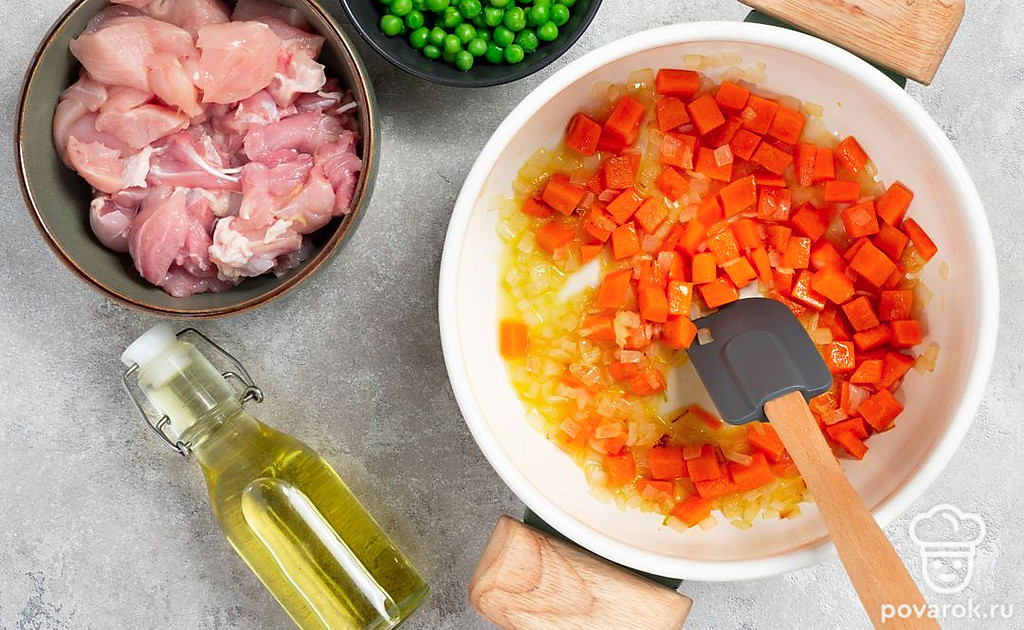 Начните готовить гуляш. В сковороду налейте масло и слегка обжарьте на ней морковь и лук до небольшого размягчения лука. Переложите овощи в сотейник, в котором будете готовить гуляш. Масло со сковороды не сливайте.
