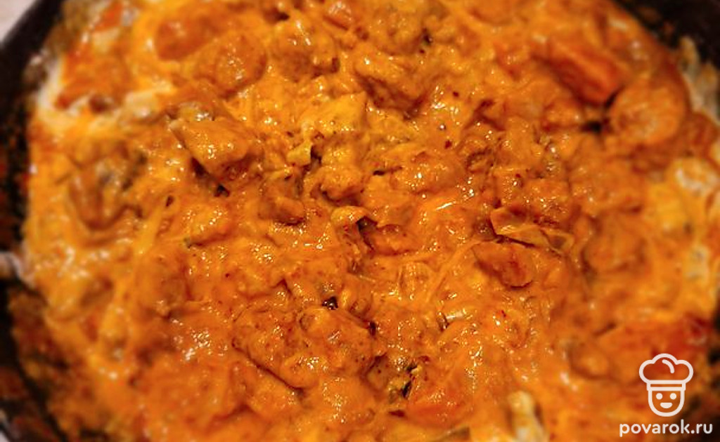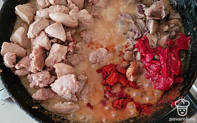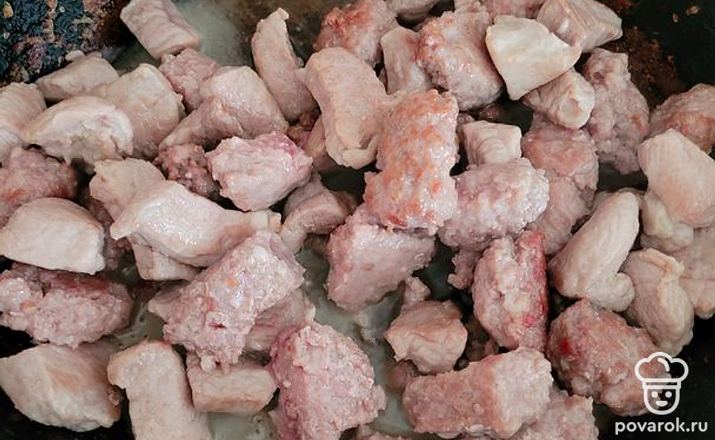 Мясо нарезаем на кубики и обжариваем на небольшом количестве масла на сильном огне до румяной корочки. После это убираем его в другую емкость.