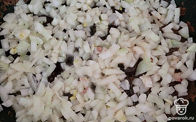 В сковороде обжариваем мелко нарезанный лук на небольшом количестве масла. Можно ещё вместе с луком отправить на огонь 2 черешка сельдерея.