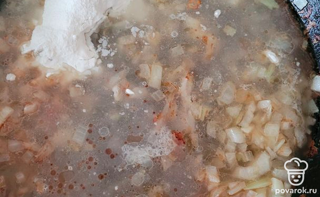 После добавляем муку и бульон. Тщательно перемешиваем. Непрерывно мешайте, пока смесь не занустеет.