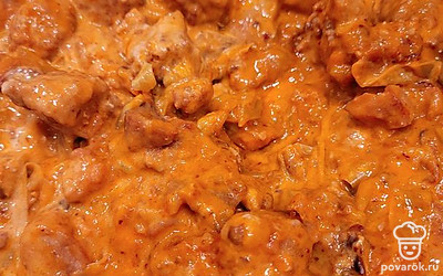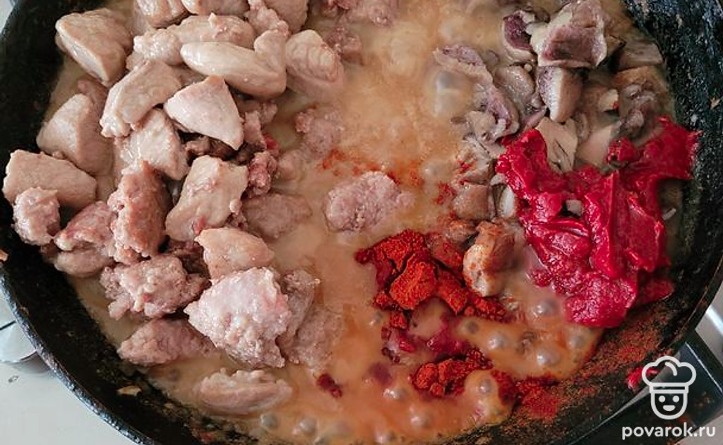 Добавьте нарезанные грибы (какие хотите), паприку, томатную пасту и жаренное мясо. Перемешайте. Томите гуляш на медленном огне 1,5 часа. Можно периодически добавлять немного воды.