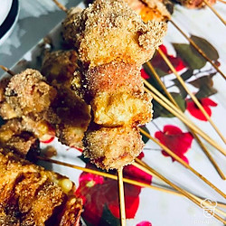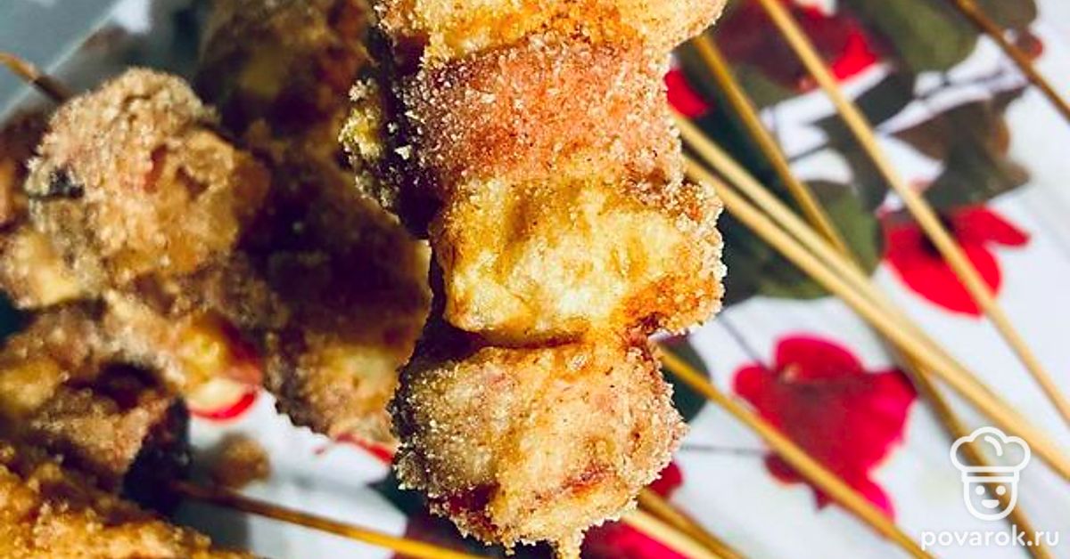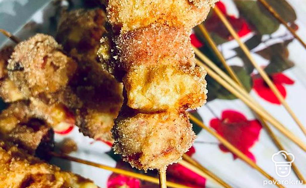 Пока фритюр греется (до 160 градусов), обмакните шпажки в яйцо, в муку, снова в яйцо и в панировку.