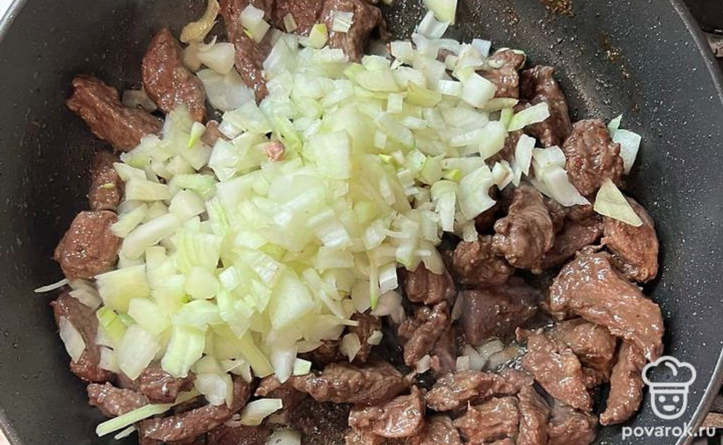 Лук почистить, нарезать, добавить к мясу. Продолжить обжаривать на большом огне, пока лук не приобретет золотистый цвет.