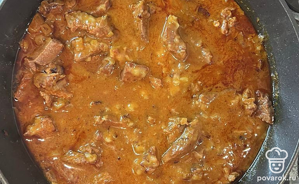Спустя 80 минут тушения влить получившуюся смесь в гуляш, постоянно помешивая. Продолжить тушить под крышкой еще 20 минут.