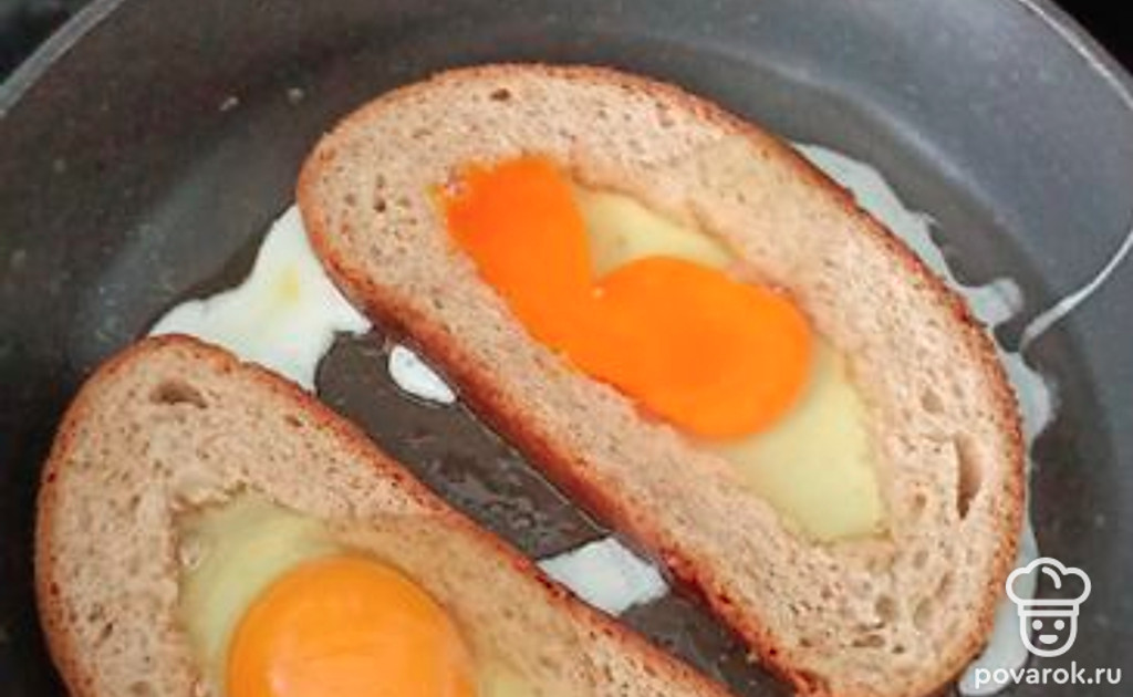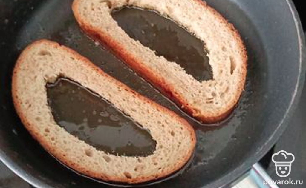 В двух кусочках хлеба вырежьте мякиш и обжарьте на сковородке.