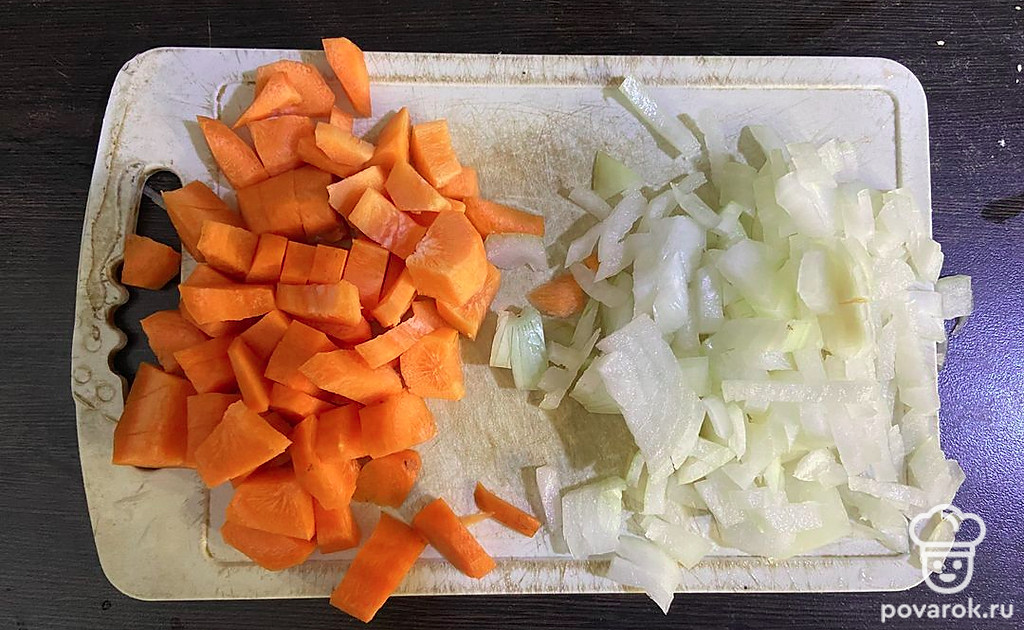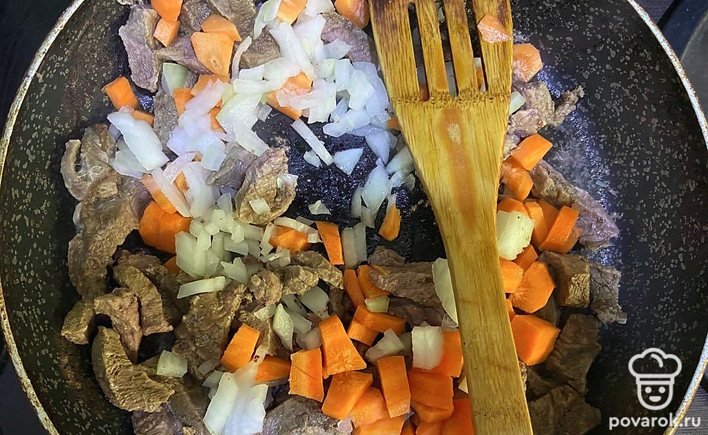 Когда мясо протушится 50 минут, слейте из сковороды лишнюю жидкость. Добавьте подсолнечное масло и лук с морковью. Посолите и поперчите по вкусу. Обжаривайте все вместе 10 минут на среднем огне.