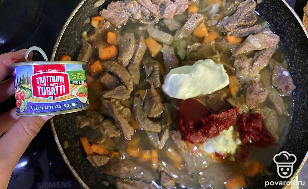 Добавьте немного воды, сметану и томатную пасту.