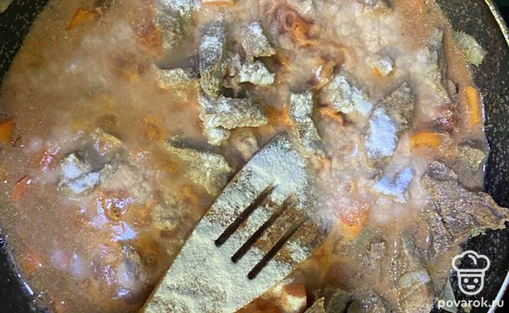 Добавьте муку. Это нужно, чтобы соус загустел. Тщательно перемешайте, накройте гуляш крышкой. Тушите на медленном огне еще 15 минут.