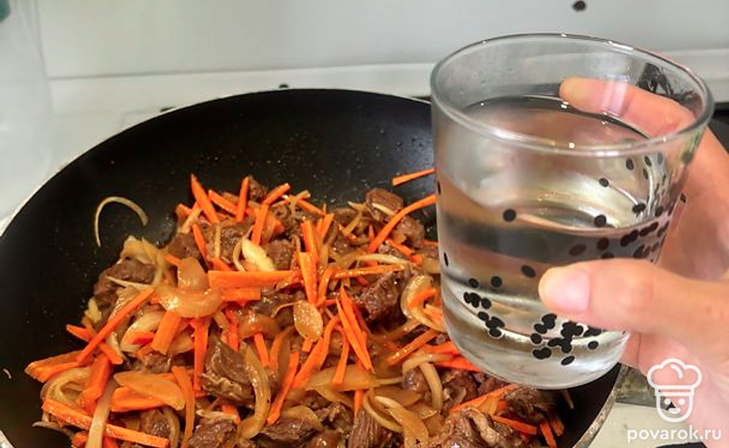 Добавьте стакан воды комнатной температуры. Включите максимальный огонь.