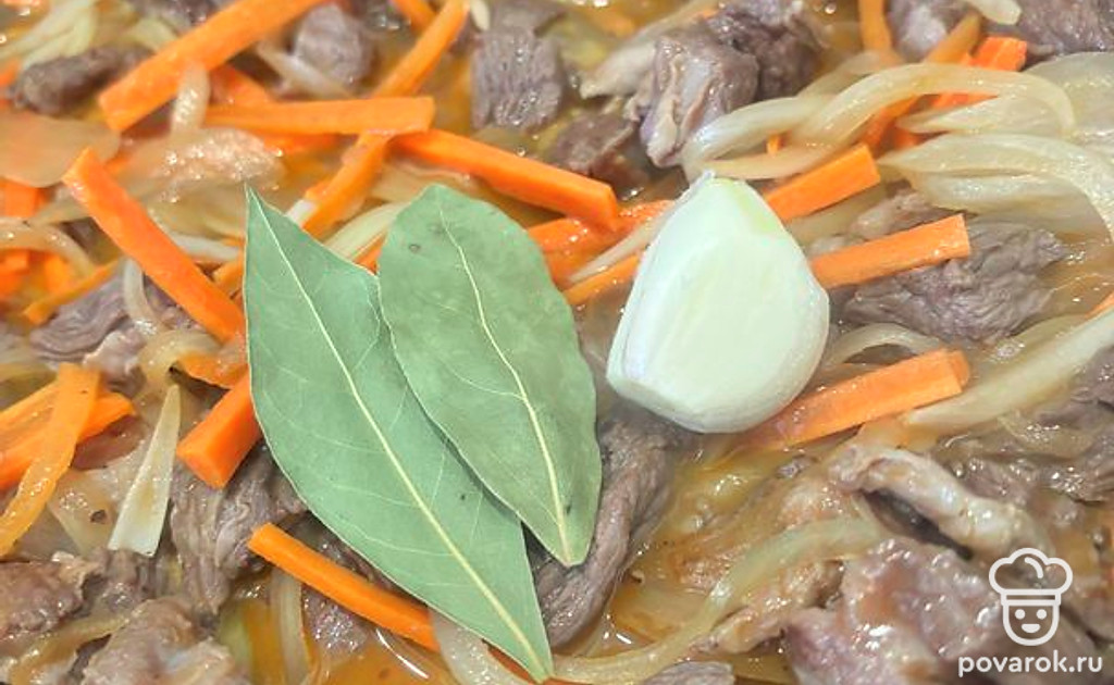Добавьте зубчик чеснока и лавровый лист для аромата.
