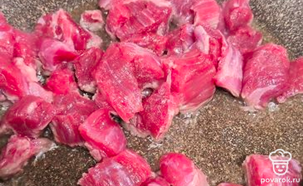 Мясо нарежьте на кусочки и выложите на сильно раскаленную сковороду с маслом. Делается это для того, чтобы мясо сразу покрылось корочкой, и лишняя влага из него не уходила. Так говядина будет сочнее и мягче.