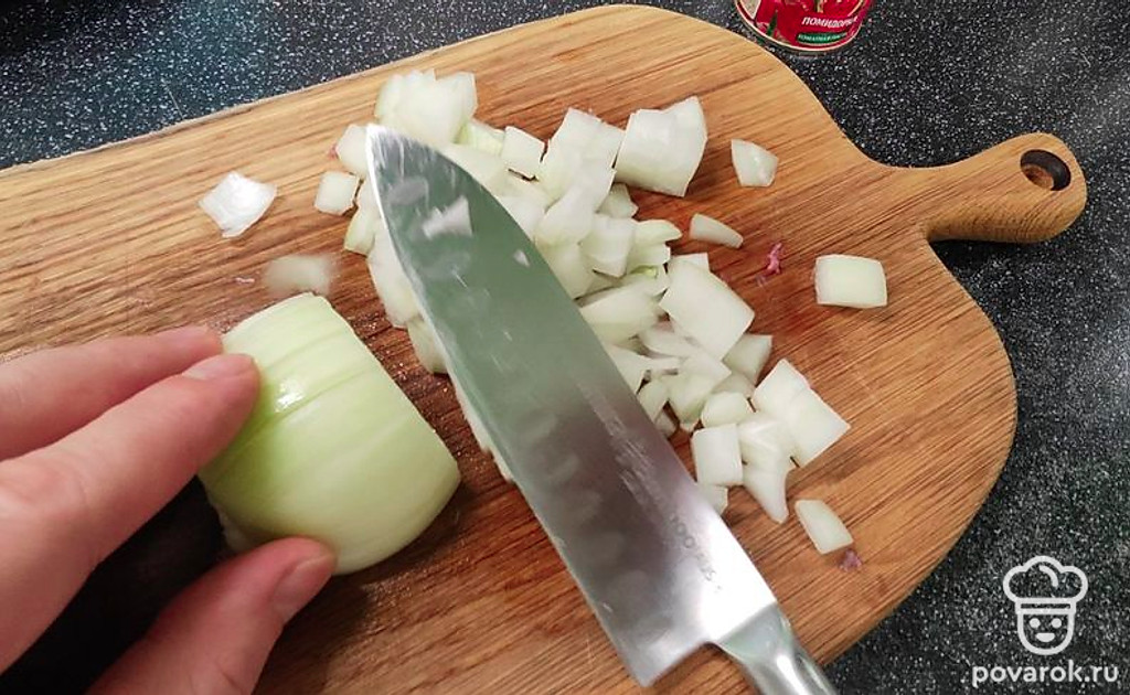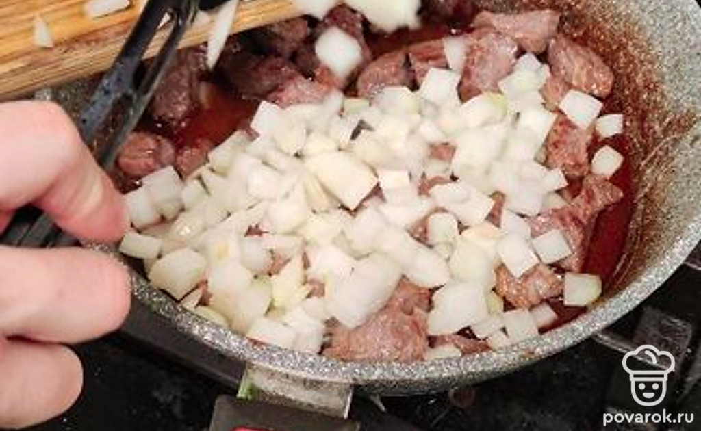 Как только мясо схватится (появится золотистая корочка), выложите лук. Обжаривайте 2-3 минуты (огонь при этом можно убавить до минимального значения).