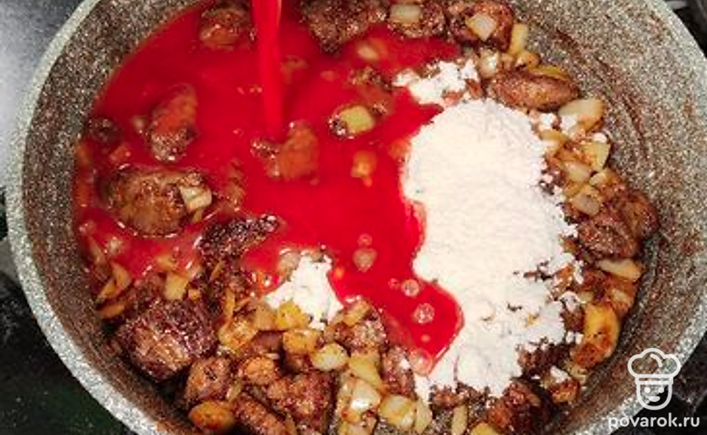 По готовности лука всыпьте муку и вылейте получившийся томатный сок.