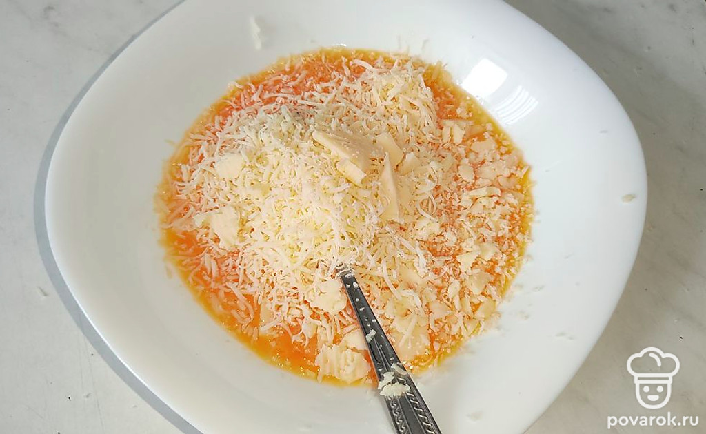 Сыр натрите на мелкой терке и добавьте к яйцам.