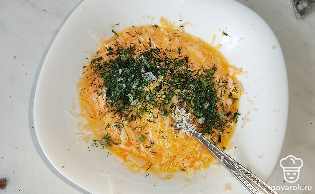 Добавьте свежую зелень, перемешайте до однородной массы.