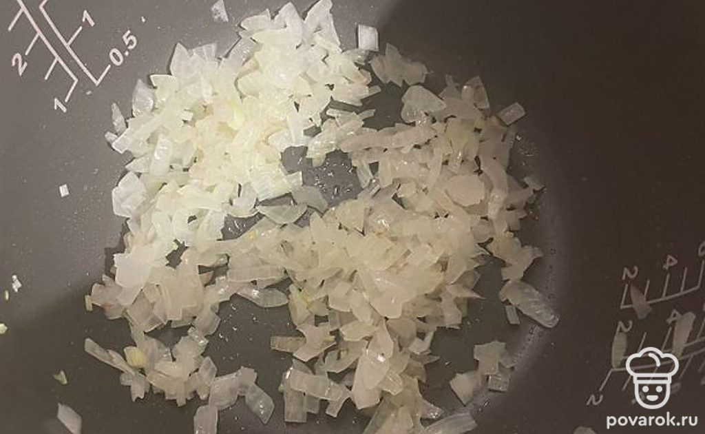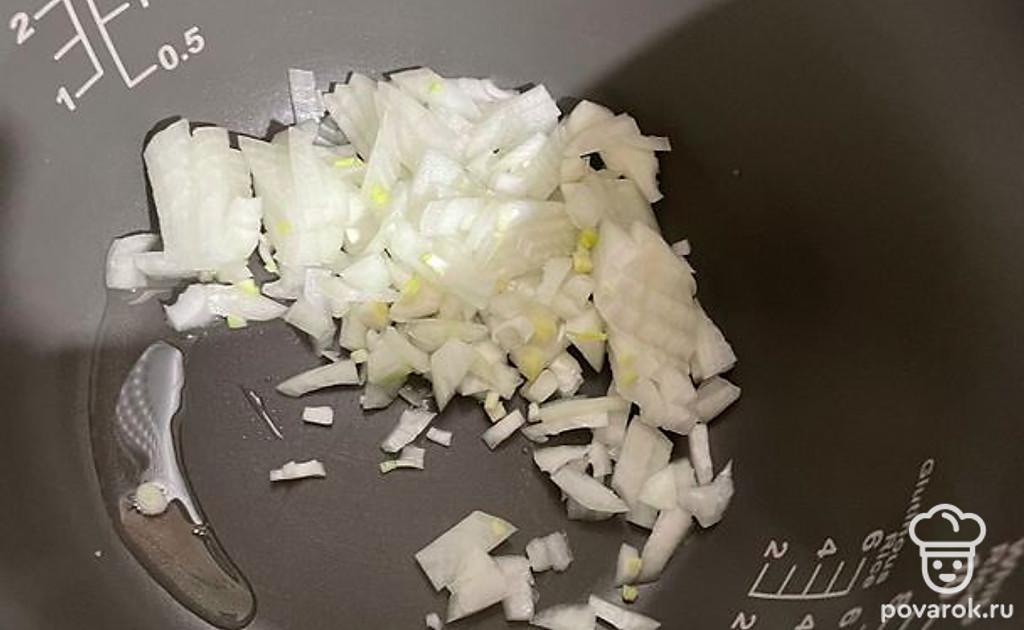 Чистим и мелко режем лук. Добавляем в мультиварку вместе с маслом.