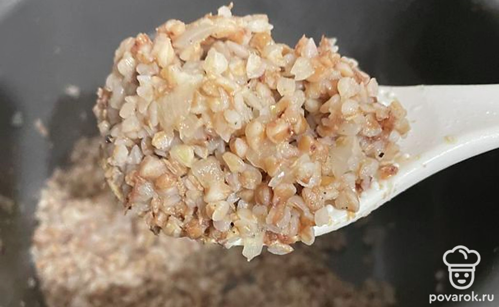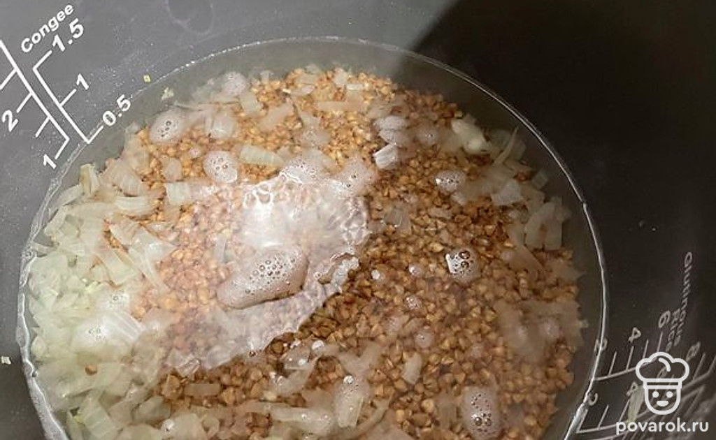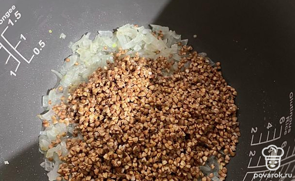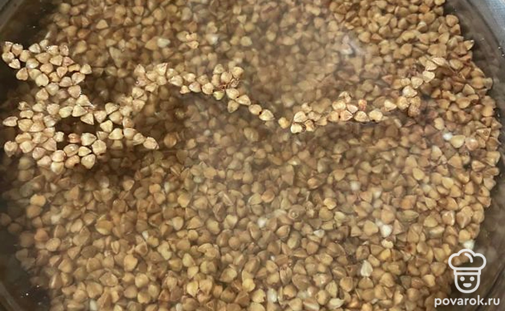 Полстакана гречки предварительно замачиваем в холодной воде, пока готовится лук.