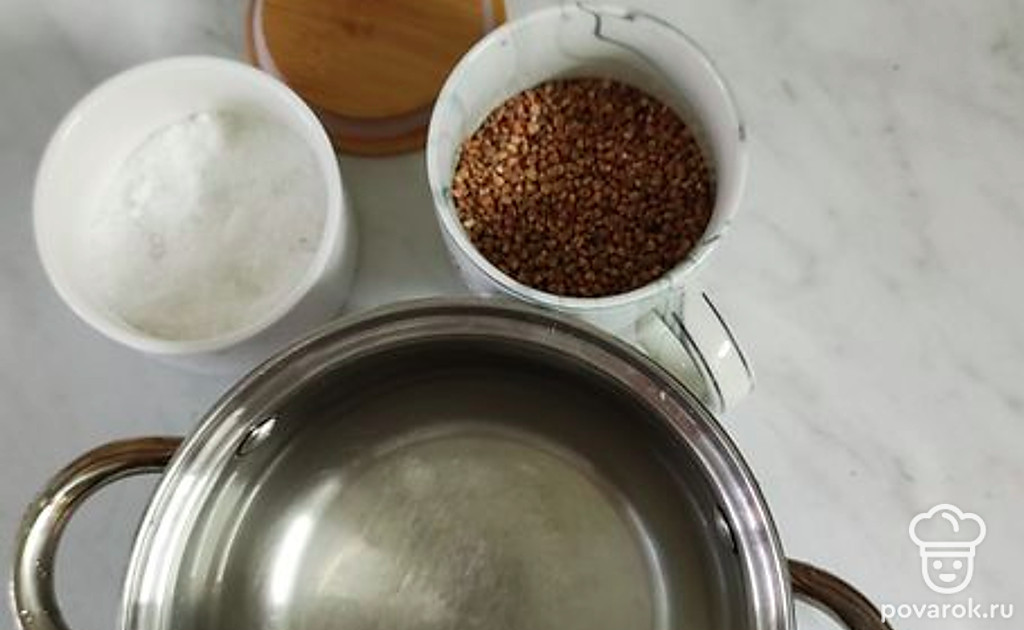 Залейте гречку водой в пропорции 1/2. Поставьте на плиту.