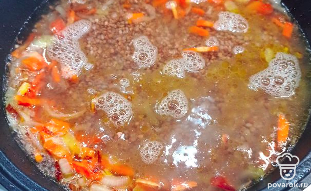 Добавляем горячую воду 1:2, солим по вкусу. Тушим до готовности.