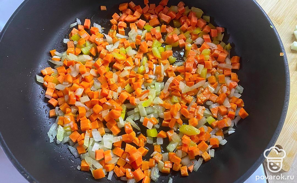 На сковороде с растительным маслом обжариваем овощи около 5 минут.