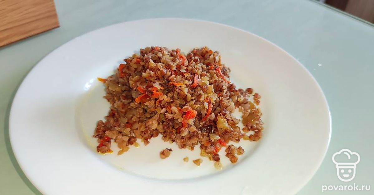 Гречневую крупу промойте под проточной водой, залейте гречку в пропорции 1 к 2, 1 часть гречки и 2 части воды. Варите на среднем огне под закрытой крышкой, до готовности. Посолите по вкусу. Смешайте отварную гречку и пережарку из овощей.