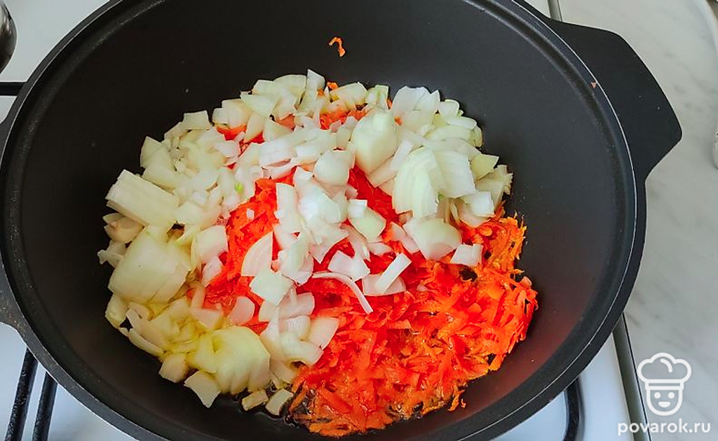 Морковь натрите на крупной терке. Лук мелко порежьте, обжарьте на растительном масле.
