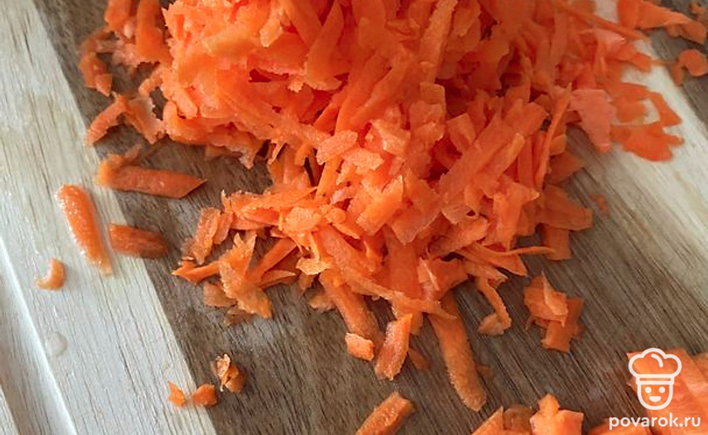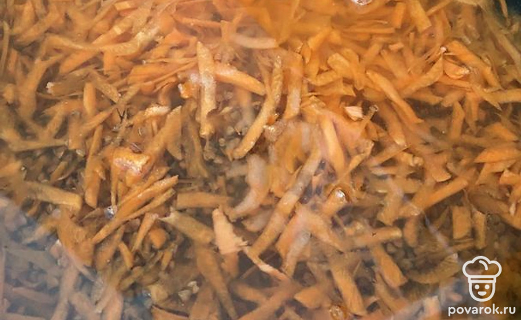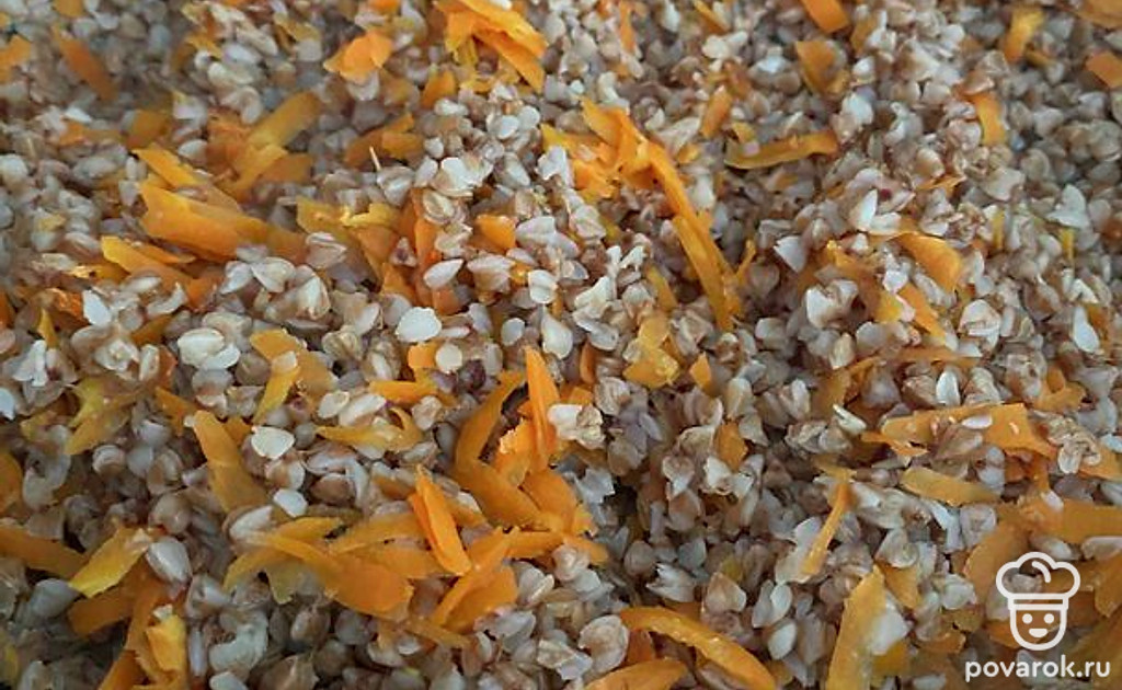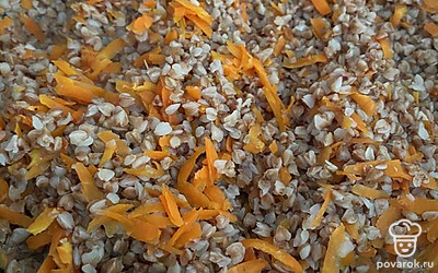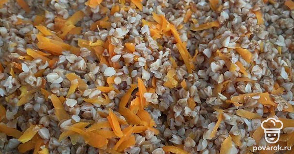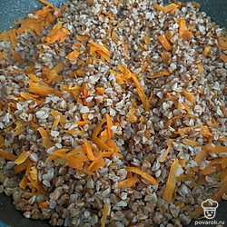 Добавить морковь к гречке. Посолить, перемешивать не нужно. Оставить в духовке на 35 минут при 160 градусах.