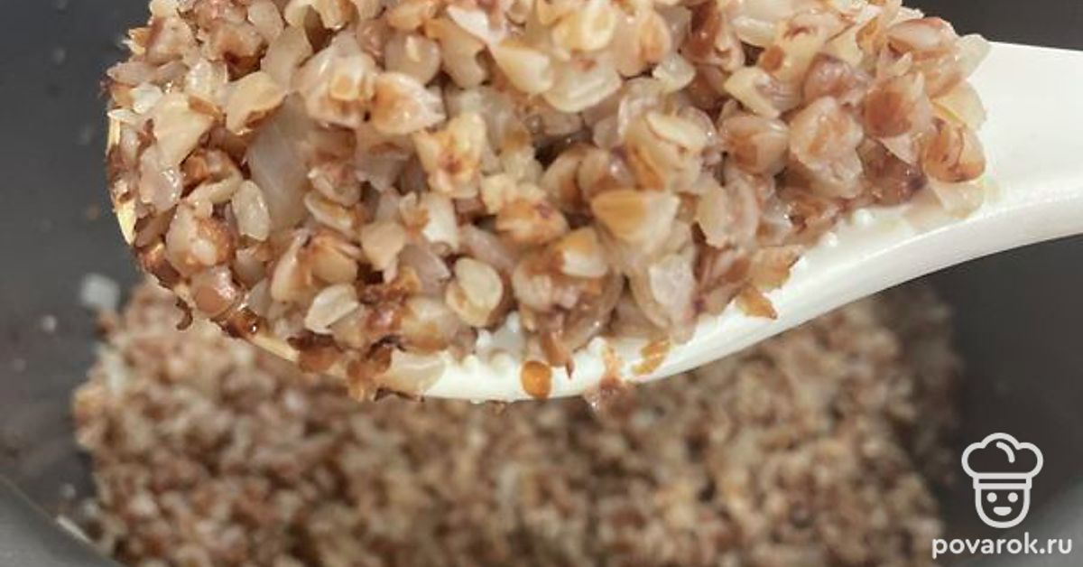 Отправляем нашу гречку к луку, предварительно слив холодную воду.