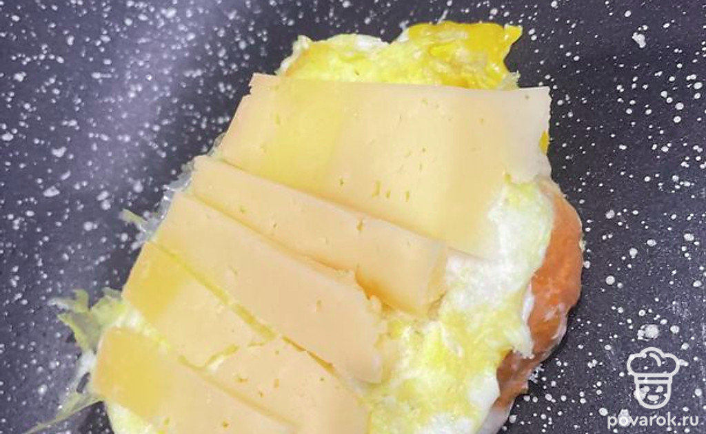 Выложите на горячую сторону хлеба и подержите на сковороде под крышкой до полного расплавления сыра.
