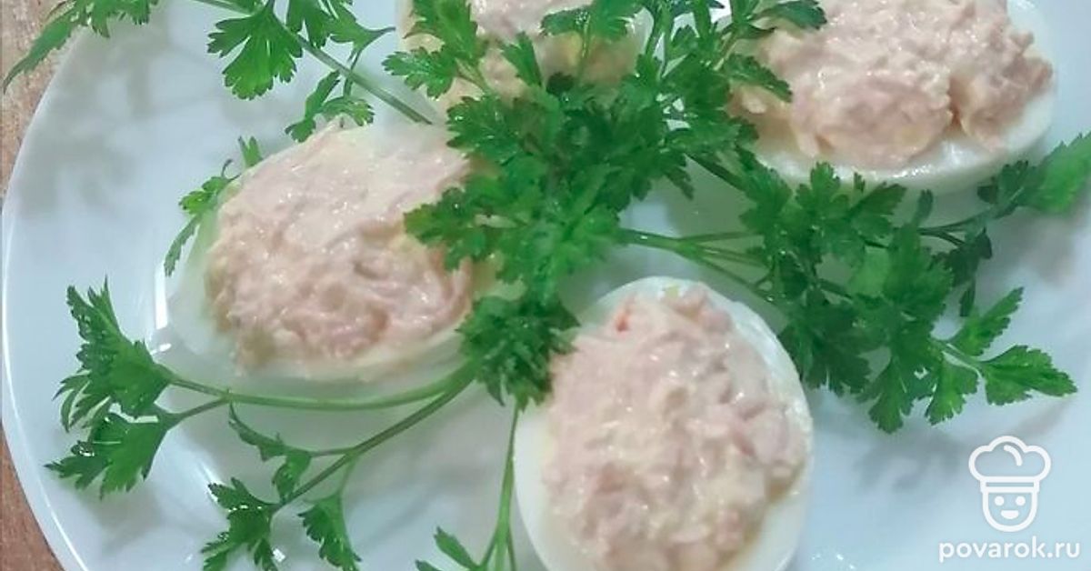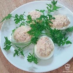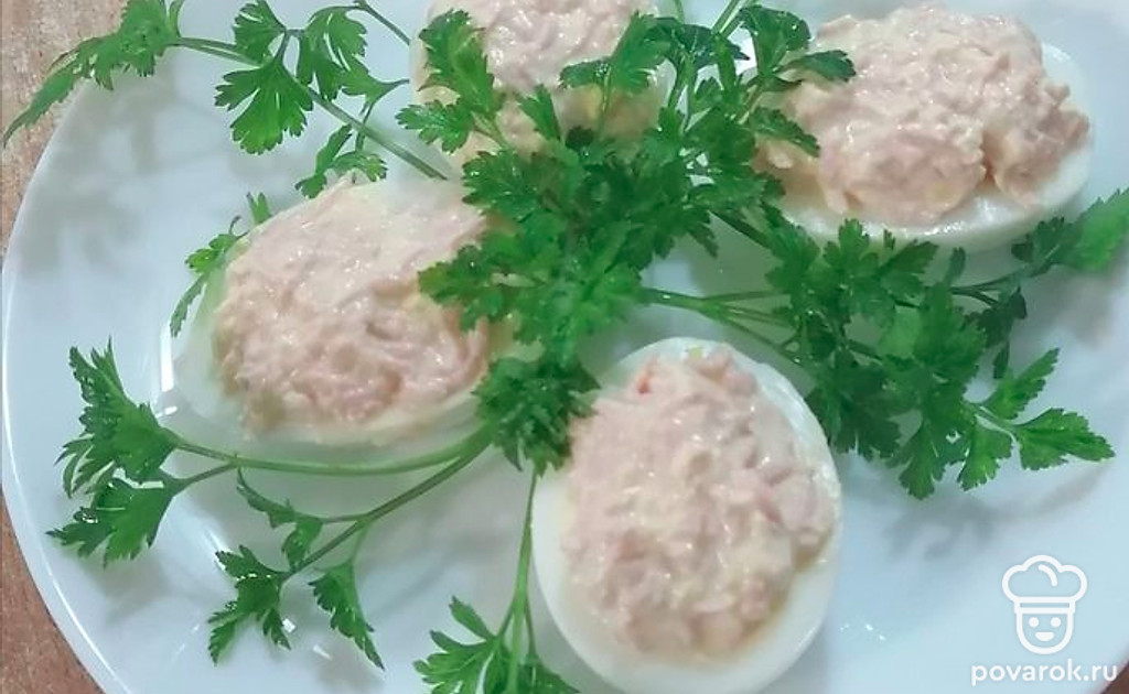 Эту смесь горкой аккуратно выложить в белки. Украсьте зеленью. Блюдо готово!